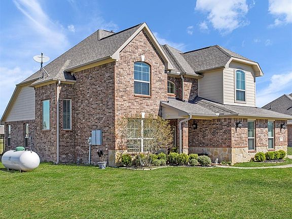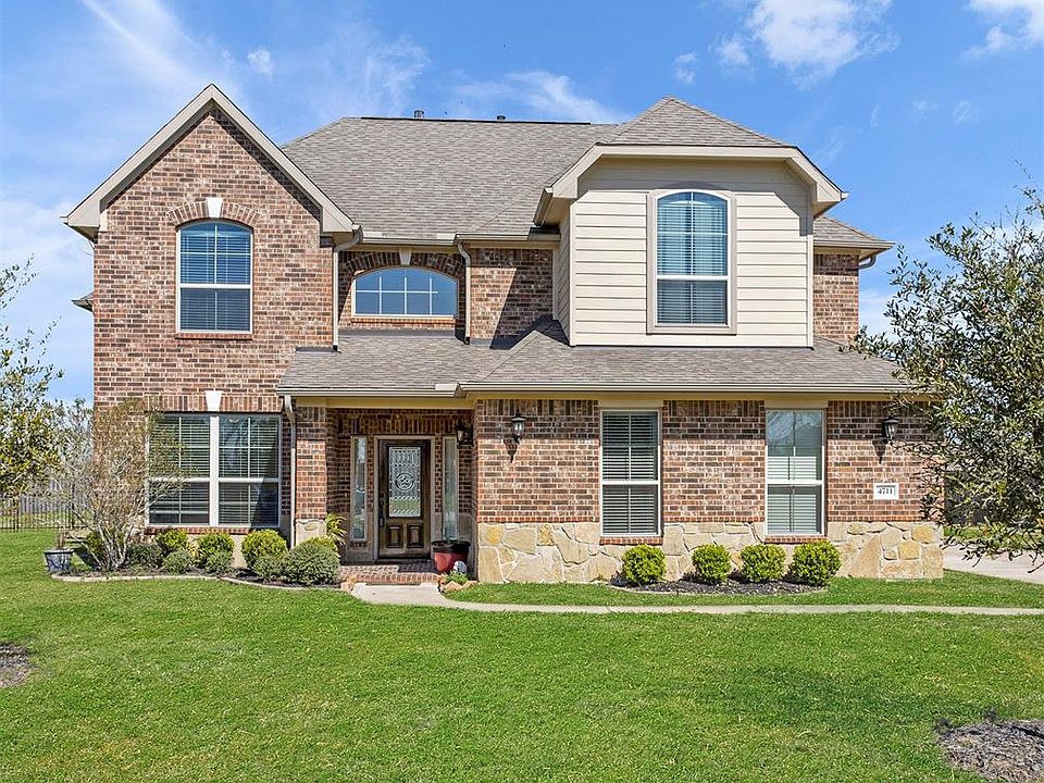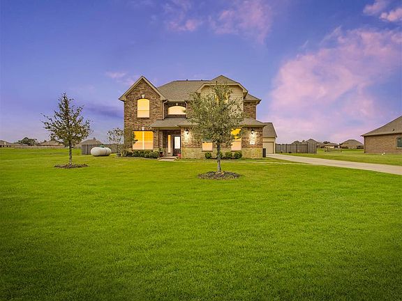 Waterfront home in Rosharon! Set on a full acre in beautiful Magnolia Bend. No MUD taxes! Dazzling curb appeal with soaring brick/stone exterior, inviting front porch and detached garage. Bright and airy interior with large windows and dramatic ceilings. Gorgeous catwalk with scroll work design overlooks the large great room with simple lines and view of the lake! The five bedroom open floor plan includes formal dining and a private study behind French doors. The downstairs media room can also serve as a bedroom. Beautiful upgraded kitchen has extensive 42 cabinetry, granite counters and amazing backsplash. Sparkling stainless appliances include a gas cooktop. Tray ceiling at the Owners suite with sitting area and private bath featuring separate grooming areas, oversized shower and large walk in closet. Game room up with study nook. Huge fenced backyard with endless possibilities! Enjoy country living at its finest, only minutes from the city!