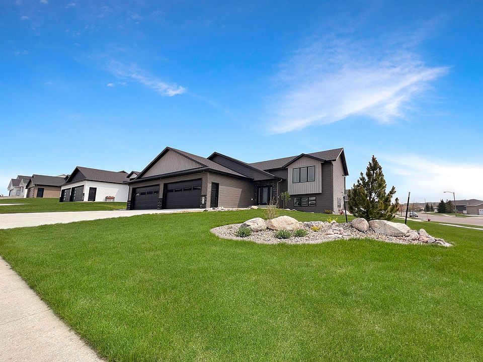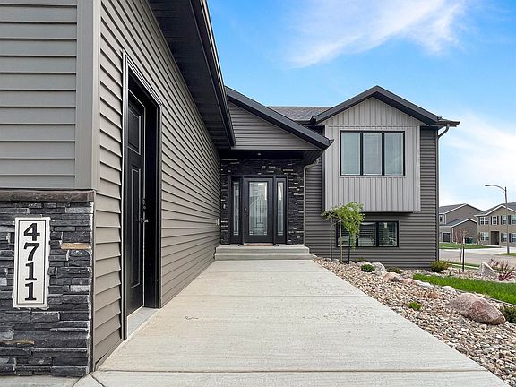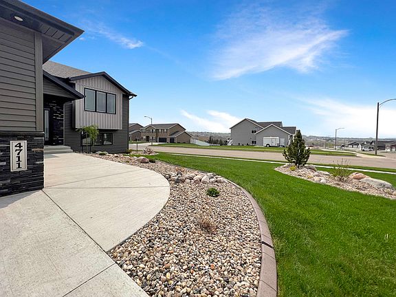 Welcome home to 4711 Marsh Hawk Drive! This 4 bedroom, 3 bath, FOUR-stall garage showstopper is tucked away in NW Bismarck's Eagle Crest 6th Addition. Upon arrival you'll immediately notice the curb appeal with two-tone grey siding accented by cultured stone and soffit lights. This home sits on a large 95x141 corner lot with VIEWS! Professionally curbed landscaping wraps the exterior with perennials, rocks, boulders and a sprinkler system. Inside, you'll be warmly welcomed with a smartly designed floorplan geared for entertaining and everyday living. The gourmet kitchen has laminate flooring, is lined with custom shaker cabinetry and offers sleek quartz countertops, tile backsplash, under cabinet & accent lighting, island, pantry and stainless steel appliance ensemble including a gas range. Savor your meals inside or head out to the oversized deck for outdoor dining or to sip your beverage of choice and enjoy the views. Natural light is abundant with windows a plenty and don't worry as custom blinds throughout provide shade control. The living room is carpeted with triple picture window. The primary suite has carpeting, ceiling fan and can accommodate extra-large furniture. The private en suite features dual sinks, tile flooring and a vaulted walk-in closet worth writing home about – check out that triple rod system! Rounding out the main level is a second bedroom, full guest bath with linen closet and in-hall storage. The daylight basement is fully finished with HUGE family room featuring an electric fireplace and recessed lighting – PLENTY of space to situate furnishings to your liking. Bedrooms 3 & 4 are both good sized with plush carpeting and there's a third bathroom space with oversized vanity. The laundry room has cabinetry and the high-efficiency washer & dryer are included. Storage space galore with mechanical room, in-hall linen closet and under foyer space – stow ALL the clutter! The four-stall garage is impressively fully finished with floor drains, gas heater, water spigot & utility sink, extra lighting and convenient walk-through door. Convenient location with quick access to major thoroughfares and close proximity to schools, parks, restaurants and retail amenities. If you're looking for a NEXT-to-NEW & move-in ready home, this is your turn-key ticket – check it out today!