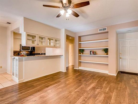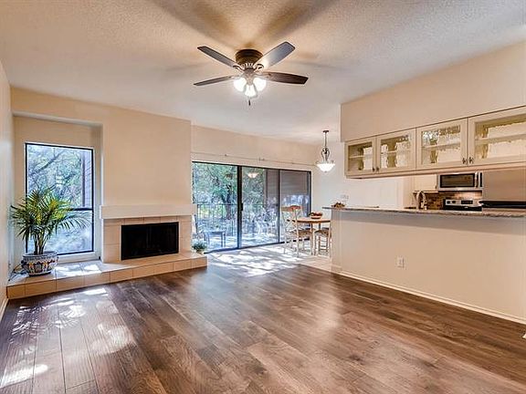 Cute, clean and move-in ready! Features include: wood floors, granite counter tops, kitchen cabinets with wavy glass fronts & artisan knobs, additional glass cabinet at end of kitchen counter, under cabinet LED lighting, dual under mount kitchen sink, Large built in bookcase, twin head ceiling fan in Master, newly installed ceiling fan in living room, freshly painted interior. Great location in Northwest Hills. Close to the Arboretum and Gateway shopping centers. Easy Access to Mopac and downtown.