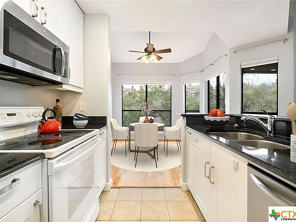 Wonderful condo in a GATED COMMUNITY! The second-floor ground entry with no stairs making it easier to access the condo. Once inside one of the best features is the oversized balcony with great views which are certainly appealing. The interior details, such as beautiful wood floors, tile in the kitchen and bath, granite countertops, and a breakfast bar, contribute to the overall charm of the condo. The wood-burning fireplace with built-in bookshelves adds a cozy touch to the living space, and the vaulted ceilings enhance the openness of the floorplan. The inclusion of ceiling fans in each room, new thermal shades in the dining area, a newer water heater installed in 2019 are thoughtful additions. It's great to know that the refrigerator was purchased in 2021, and the convenience of having a washer and dryer that convey with the property is a definite plus. Overall, it's a comfortable and well-maintained condo and only minutes from Mopac & 360.