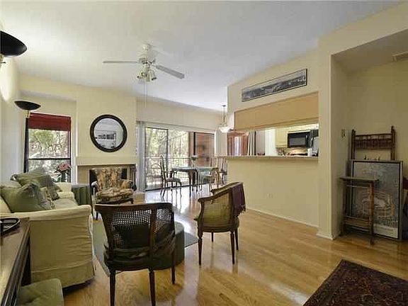 Beautifully secluded 1st floor Unit with tranquil view of the woods from your private balcony! Peaceful & quiet, yet just minutes to Mopac, 360 and the Arboretum. Upgraded Kitchen boasts Tile Countertops,Breakfast Bar, and Updated Cabinets. Gorgeous Engineered Hardwood flooring throughout unit. Spacious living room with built-in bookcases & fireplace. Awesome pool area with 2 pools and clubhouse nestled in the trees. Washer, Dryer, and Refrigerator convey. Owner says free rent and utilities for September!Owner pays for water and trash and HOA dues