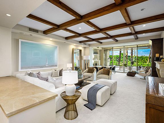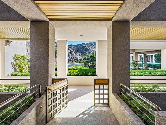 This first floor 'A' plan Terrace features magnificent views of the 7th Green of the Club's Mountain Course and the majestic San Jacinto Mountains beyond. Its floor plan contains a primary suite with large ensuite bath, and a step-down lanai area designed as an office with a sitting or workout space that opens to a secluded patio. The guest suite boasts an ensuite bath and large closet. The kitchen has an expanded breakfast nook with cozy fireplace and banquette seating and overlooks the open dining area. The step-down living room includes a sit-down bar area and a statement fireplace. The spacious balcony wraps from the living area to the primary suite, and as a first-floor unit it also offers gated passage to the greenbelt beyond the balcony. With approximately 2,771 square feet of living space per public records, this unit is designed to create a stress-free living environment within an exclusive country club community focused on quality at every level. Ownership of a Terrace also includes subterranean parking for two vehicles and your personal golf cart and storage area. OFFERED UNFURNISHED - PRESENTLY STAGED FOR SALE.