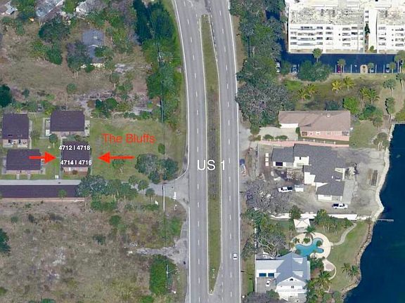 ATTENTION INVESTORS!!! Rare Find 4 Unit Condo Building in ''The Bluffs'' FOR SALE, AS-IS. Currently Tenant Occupied. EACH Unit is a 2Story with 672 SF plus 1 Car Garage (Detached) & 1 Assigned Open Parking Space. Kitchen, Dining area, and Living Room with Sliders to a Patio are on the Main Floor. Bedroom, Full Bath, and Utility Area with Laundry Hook Ups (AC/WH) on the Second Floor. 2 Units Face East, 2Units Face West (Patios North & South Sides). Directly Off US1 Across from the Indian River. Partial River Views. FIXER UPPER - Several Units in need of Electrical & Plumbing work plus Cosmetics. One Unit available by appointment (prior day notice), others after contract. Photos are of all units - Kitchen, Living, Bed, Bath of each and exterior.