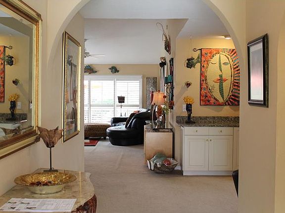 Maintenance free Gorgeous Tropical Villa with barrel tiled roof (new 3/17) and a 2 car garage attached. 2 bedrooms plus open den/office. High ceilings, open floor plan conducive to entertaining, relaxing, and enjoyment. Two bedrooms with a den. Plantation shutters on all windows/sliders for natural light adjustments. NEW A/C June 2017. Air handler routinely maintained. Built in cabinet already plumbed for a wet bar. Freezer in the garage to stay.So many Extras, like an air condition in-garage storage/pantry. Energy efficient sound proof windows. Non enclosed rear walk way to tiled path courtyard with flowers & shrubs, and screened lanai with a view of the lovely lush flowers and trees. Trucks & motorcycles allowed if garage kept. In the UP & COMING IMG and El Conquistador area. Golf, tennis courts within 1/2 mile. Furnishings negotiable. Lovely art and beach motif with designer taste furniture. Dignified Entry to the developement.