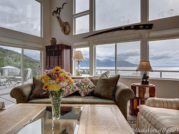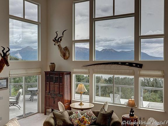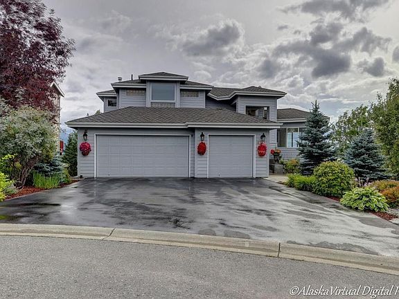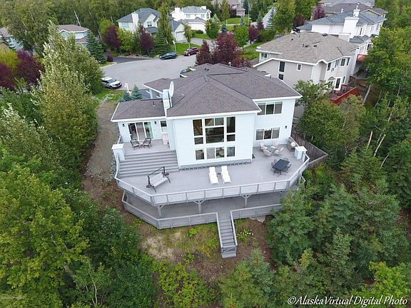 This distinctive one of a kind home takes full advantage of spectacular southwest views of the Chugach & Cook Inlet. The soaring two story Great Room opens to an enormous Trex deck inviting outdoor living year around. The spacious cherry kitchen w/Corian counters & stainless appliances offers enormous storage. The master suite is on a floor of its own with his & her closets & private laundry.