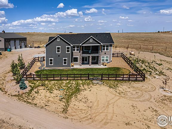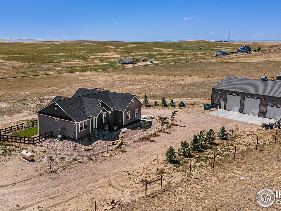 Nestled on a hillside overlooking rolling plains & views of Longs Peak, this custom 2 yr old ranch style home boasts taste, quality, & attention to detail. Cathedral ceilings in the living & stylish box beams provide a light & airy feel, floor to ceiling stone fireplace. Kitchen w/ quartz countertops, beautiful upgraded cabinets, SS appliances, gas range w/ pot filler & dbl. convection ovens looks out over covered deck. Master suite w/ dual vanities, spacious shower, soaking tub & walk-in closet. Full, unfin walk-out 9 foot bsmt with high efficiency furnace, tankless W.H., water softener & filtration sys. Wired for future generator. Security cameras installed & included. Fiberoptic Internet through Nunn phone co. $225,000 64X48 shop w/ 3-12x14 overhead doors & 1-10x10 overhead door easily accommodates a full size RV. Full concrete, concrete apron, fully insulated w/ spray foam, electrical run w/ extensive ext. lighting, plumbed for future bathroom. Great well. No covenants or HOA.