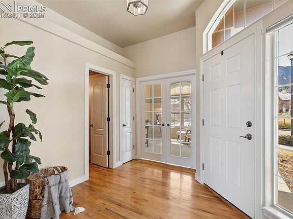 Charming patio home on corner lot with mature landscaping and captivating views of Cheyenne Mountain. Covered 10x6 front porch welcomes you into an inviting entryway with gleaming hardwood floors. Just off entry, behind French doors, you'll find versatile office with a closet—ideal for storage. A full bathroom with raised vanity and tub/shower combo adjoins office for added convenience. Across entry, the formal dining room offers stunning mountain views and flows seamlessly into well-appointed kitchen. The kitchen is a chef’s delight, featuring stainless steel appliances, built-in oven, electric cooktop, granite tile counters, porcelain tile backsplash, counter bar, maple cabinets with crown molding, and walk-in pantry. Adjoining breakfast nook with bay window captures city views and natural light, creating a cozy spot for morning coffee! Open-concept kitchen and nook lead into spacious great room with 10-foot ceilings, hardwood floors, and gas fireplace flanked by lighted built-in niches. Step outside to a low-maintenance composite deck—perfect for entertaining or enjoying the peaceful surroundings. The main-level primary suite is a tranquil retreat, with private deck access, 10-foot ceilings, a ceiling fan, and generous 10x13 walk-in closet. Luxurious 5-piece bath includes double sinks with tile counters, raised vanity, jetted soaking tub, large shower with built-in bench and glass block window, plus private commode room with a door and its own window. Also on the main level: a laundry room with utility sink and upper cabinets for extra storage. A wide landing on the staircase leads to a bright, finished basement with 9-foot ceilings and a large family room featuring a second gas fireplace and walk-out access to a 10x10 concrete patio. Two spacious bedrooms, a full bathroom with tiled floors and counters, and a generous linen closet provide comfort and flexibility for guests or multi-generational living. A sizable unfinished storage room completes the lower level.