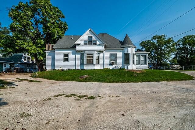 Charming 2-flat with turret defines the vintage character . As part of commercial growth in the early 1900's, it is believed that this house was built to serve the phone company for this area in 1915. Transition to duplex: main floor has 3 bedrooms; upper has 1 bedroom;much original woodwork, many updates (see ''documents''), functional basement. Two tax parcels (corner lot has the newer 14'x22' garage--rented with upper unit). Parent parcel (0710) has the beautiful home and 630 SF garage (rented with 1st Floor); over 1/2 acre. TWO: lots, gas and electric meters, furnaces, HWTs. Fox River access via park is 1/2 block away. High and dry location for this one-of-a kind property in western Kenosha County.