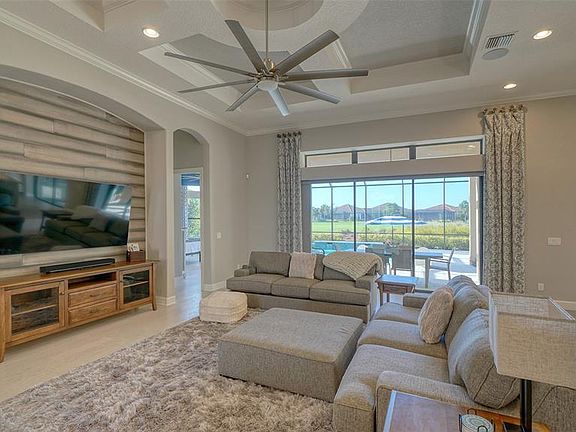One of Taylor Morrison's great builds in Esplanade of Lakewood Ranch. This singe family home has soaring decorative ceiling through out the entire house with no carpet just upscaled flooring throughout. The volume in this open floor plan is all bright nature sunlight which makes great for gatherings. The dry bar with wine cooler, booze mixer and latte maker is next to the formal dinning area for all of your guest needs. The office/den is delightful with an oversized work space for everyone. Master bedroom has great views overlooking the pool area, greenery and outstanding sunsets. The over sized kitchen is not missing anything for your chef at work with double built in ovens, gas iron cooktop with stainless hood, more then enough tall white cabinets and stone counter top work space galore. Let go outside to the best outdoor living space you could ask for. Nice big covered area with full outdoor kitchen and grilling area with hung TV to watch. No one will be left out as many areas to stretch out on lounge chairs or seating by the fire pit table to enjoy.
