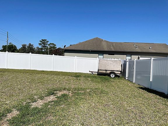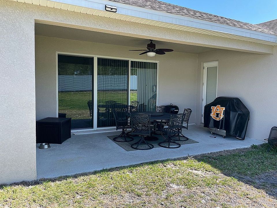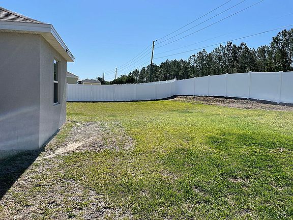 This one-story, all concrete block constructed home has a truly open concept plan, featuring a large great room that flow out to a covered lanai. The owner's suite with ensuite bath are located at the back of the home for privacy. Three additional spacious bedrooms, one with its own ensuite bath and walk-in closet, share the front part of the home. This home comes with installed stainless steel dishwasher, range, and microwave. Finished 3 car garage with epoxy floor and added lofts for additional storage. Double side garage has a smart opener that links to your phone. The front door also has the smart video allowing you to answer the door bell from your phone by talking and seeing who's at your door. Alexa is included. A 6 foot tall white vinyl privacy fence encloses the back yard. Yard is completely irrigated. Ceiling fans in all of the rooms including the lanai. Granite counter tops in kitchen and bathrooms. Tile and carpet throughout the house. >> Buyer's agents welcome.