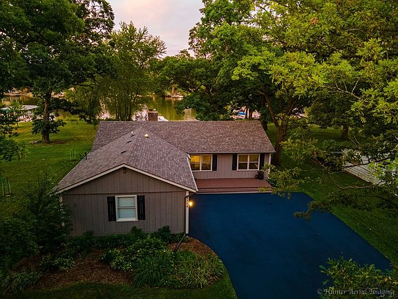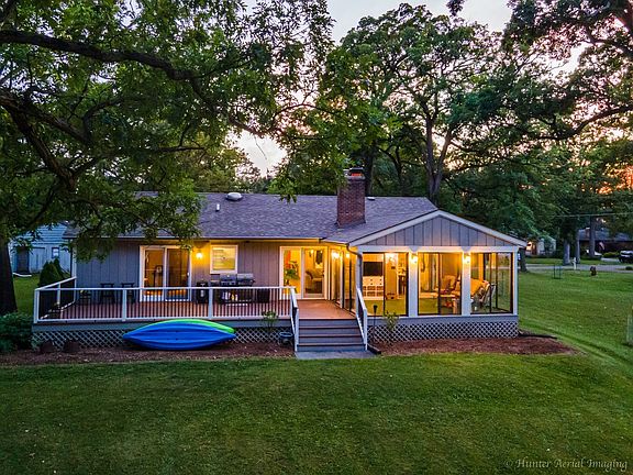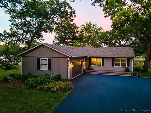CLICK ON VIDEO at the top of the listing photo! Wow! Work from Home Paradise! Nestled among the Mighty Oaks and located in the heart of the Prairieview Conservation District, you will fall in love with this Fox River waterfront remodeled ranch home! All new Kitchen updates include newer Schrok cabinets, stone back splash, under cabinet lighting, Corian counter tops, desk, wet bar, ceramic tile flooring, Center Island, Stainless Steel appliances and recessed lighting. 18x10 Eating Area included in the Living Room Combo. 5" dark Oak hardwood flooring throughout. Great Room with wood burning, gas start fireplace opens to spacious 3 season room and new deck with stunning River views. Sliding doors in Master bedroom with private master bath also opens to the deck, backyard with fire pit, private pier and wide open River! You will find many special features throughout! Full bath located in the look out basement along with a 13x11 4th bedroom option, gas and water hookups for possible kitchen and laundry area. (There is laundry hook up capability on the main floor.) Water filtration system. Newer roof and driveway. Vacation all year round!