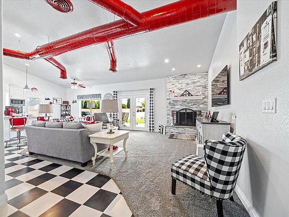 The open-concept living room features a vaulted ceiling, classic exposed ductwork, and a gorgeous wood-burning gas fireplace. The upgraded carpet adds coziness, while the retro black-and-white checkered tile flooring brings character. The kitchen is a dream with soft-close cabinetry, granite countertops, a farmhouse sink, a pot filler over the stove, and high-end appliances. A large pantry offers plenty of storage, and the laundry room includes an ironing board cabinet and a skylight.