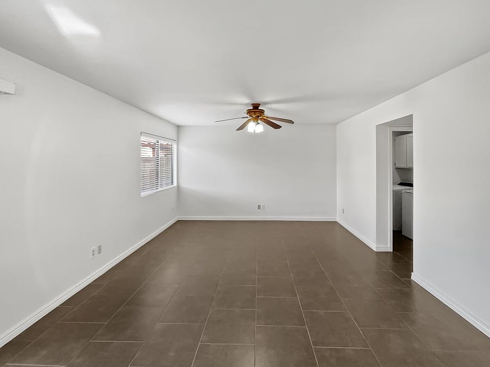 The living room offers ample space for relaxation, while the kitchen is equipped with granite countertops, a microwave, refrigerator, freezer, and dishwasher. Each bathroom includes a tub/shower combination, and the home is fitted with tile floors throughout. Additional amenities include heating, air conditioning, and ceiling fans for comfort. The property also includes laundry facilities with a washer and dryer. Outside, there is a patio area suitable for outdoor activities. All utilities are included in rent except for the Lawn, Cable, and Trash.. Utility would be transferred on the first day of moving in.