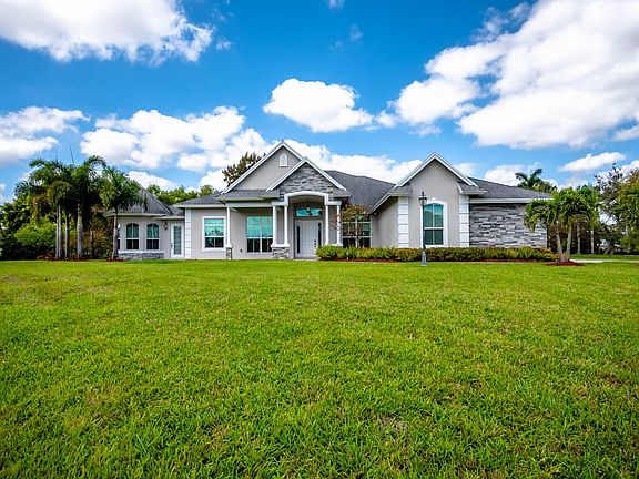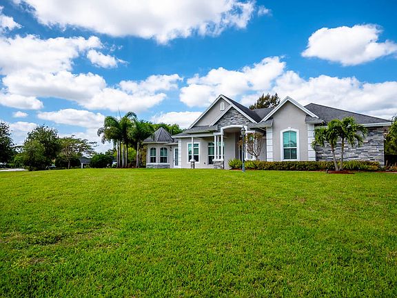 Welcome to your dream home in Legend Lake Estates! BUILT in 2018 by Vista Builders! This LAKESIDE property on a 1.27 acre CORNER LOT features 4 bedrooms plus loft/office, 3.5 bathrooms, a 3 car garage with oversized driveway, POOL and so much more. Zoned for all ''A'' rated schools and close to great shopping and dining, with asy access to the FL turnpike. The split floorplan boasts 24'' porcelain tile flooring, complemented by upgraded baseboards, trim and crown molding throughout.All windows and doors are hurricane impact rated. The home also features an alarm system, central vacuum, roller shades, and electronic keypads on all exterior doors. The beautiful kitchen has top of the line Samsung stainless steel appliances, recessed lighting, a large pantry, pot filler feature, double wall ovens, large granite countertop island, and even lazy susans in both upper and lower corner cabinets offering convenience at every turn. The indoor laundry room is equipped with a washer, dryer, sink, ample storage cabinets as well as a refrigerator, and ice maker water line. The master bedroom offers double walk-in closets, a tray ceiling, and a den/office area. It also provides exterior access to the front porch and the pool patio. This home has 2 full cabana bathrooms connecting to bedrooms. Outdoors, enjoy sunny south Florida weather from the front porch or the lakeside pool patio. An outdoor kitchen with sink and grill allow for great entertaining! The oversized patio and pool with geated spa has a sun shelf and water features, surrounded by a travertine deck, fans and a covered screen enclosure. The lush greenery of the 1.27 acre property thrives thanks to a sprinkler system fed by the lake. A 12x16ft garden shed with electric is also included! Mature mango trees, multiple varieties of dragon fruit vines, a guava tree, and a papaya trees adorn the yard. This is more than a home. It's a where luxury meets tranquility, and every detail was thought of. Want to know more? Check out the feature's sheet and schedule your showing today!