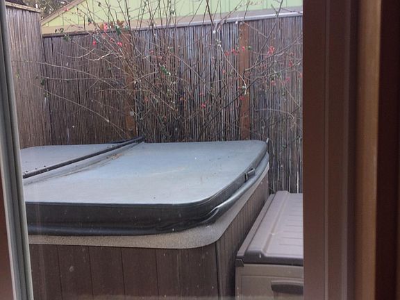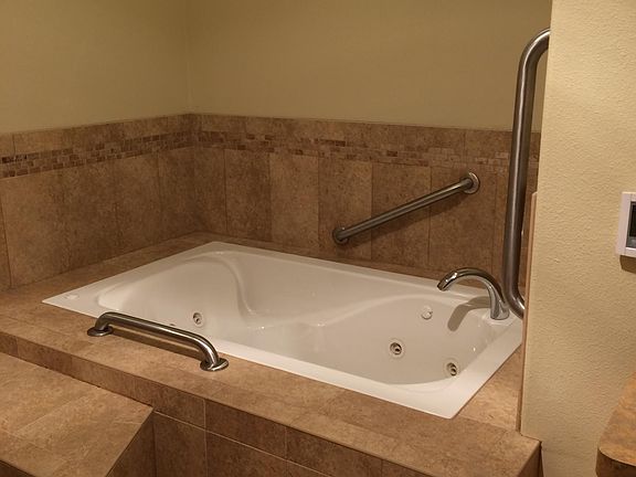 Custom home built in 2004, all accessible. One master suite with hot tub on adjoining patio, jacuzzi tub, no lip shower, built in shower bench; open space LR, DR and K, built in Cherry book cases, river stone natural gas fireplace, bamboo floors, stained glass entry; study with large closet, half bath, could easily be a child's bedroom, cork floors; dish washer, washer/dryer under built in china cabinet, gas cook top, stove, refrigerator, built in ironing board; Pear and apple tree, concord grapes, raspberries, strawberry pot, raised veggie boxes, beautifully landscaped. Vac-u-flo system and water sprinklers. Attached studio apartment retained by owner for occasional use when returning to town for Dr.'s appointments. One cat or small dog is ok. Over sized single garage included. Owner pays garbage, renter pays all other utilites