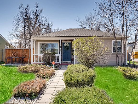 Built in the late 1940s, this Berkeley Neighborhood home pairs together old and new. Charming original hardwood floors & built-ins are accented by updated bathroom title, a barn door, granite countertops, large walk-in pantry & solar. The home's 2 bedrooms share a private hallway & full bath. A home-office area is outfitted with a large picture window and small wet bar. Wood-trimmed French doors off the kitchen & dining give way to a side patio spacious enough to host outdoor dinner parties. An additional set of French doors from the family room uncover an extended outdoor living area w/ impressive vaulted, wood beam & metal-covered patio. The backyard includes an established garden area, utility shed & sprinkler system. Detached 2-car garage yields built-in storage & garage doors at the front & rear for added convenience. Additional off-street parking spaces ideal for large vehicles or camper trailer. Easy access to I-70, nearby parks, dining, art galleries & Regis University.