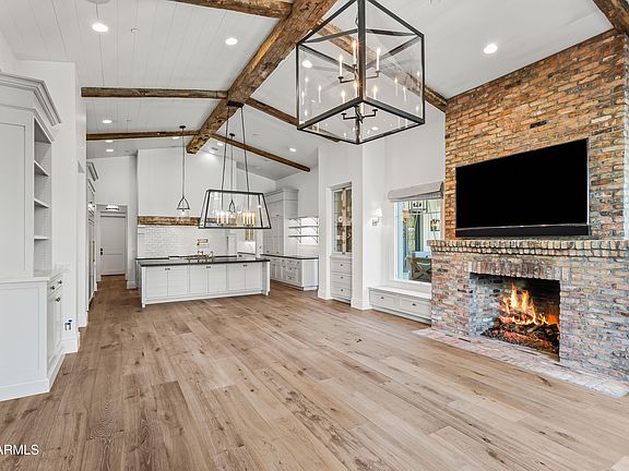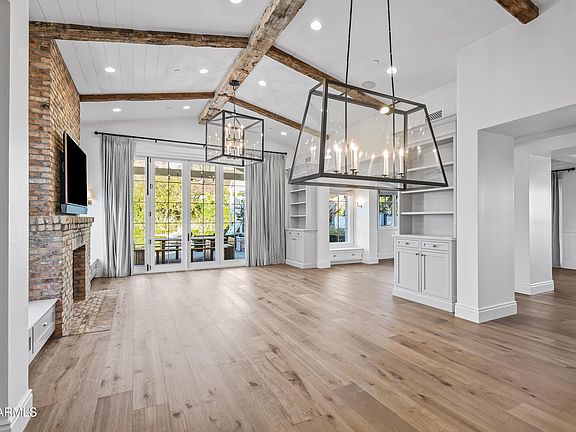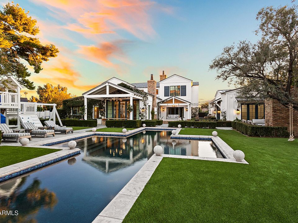 Situated on a quiet cul-de-sac in Arcadia Proper and within the highly sought-after Hopi school district, this exceptional estate rests on an expansive half-acre-plus lot. Originally built by Santorini Homes and newly remodeled by GM Hunt, the residence is complemented by lush, professionally designed landscaping by Refined Gardens and Roots Up, creating a private and timeless setting. The two-story main home features five generously sized bedrooms, each with its own en-suite bath, and a light-filled open-concept layout designed for both everyday living and entertaining. Wide-plank wood flooring, French doors, and refined architectural details connect the living spaces seamlessly. The great room, anchored by a brick gas fireplace, flows into the formal dining area and chef's kitchen, where paneled ceilings, reclaimed wood accents, and premium finishes elevate the design. The main-level primary suite offers a true retreat with a gas fireplace, custom built-ins, and private access to the backyard. The spa-inspired bath includes dual vanities, a soaking tub, an oversized shower, and a custom walk-in closet. Outdoors, the property delivers a resort-style experience with a heated pool and spa, sport court, mature landscaping, and picturesque Camelback Mountain views. Every element has been carefully curated to balance privacy, beauty, and functionality. A detached wellness and batting facilityfully plumbed and HVAC-equippedadds rare versatility. This flexible space may remain a private fitness and training center or be converted into a separate guest house, offering exceptional long-term value. Ideally located just minutes from premier resorts, golf, upscale shopping, and fine dining, this Arcadia estate presents a refined lifestyle opportunity in one of Phoenix's most coveted neighborhoods.