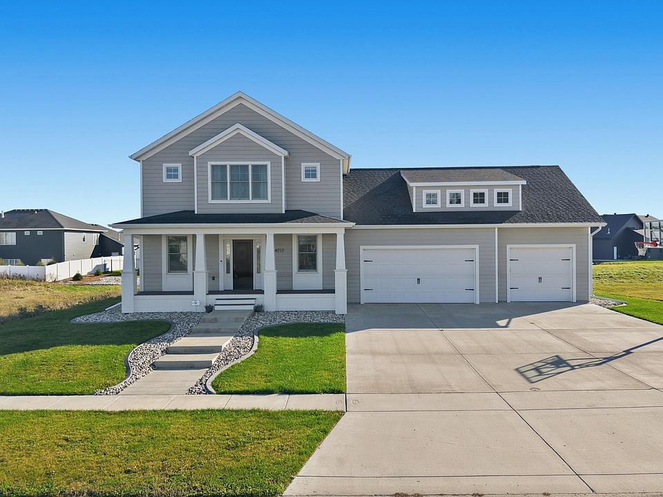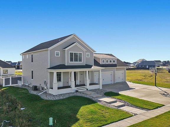 Out back, a fully fenced yard, covered front porch, and spacious patio create multiple spots to relax and play. The finished, heated, oversized three-stall garage includes two floor drains and a convenient drop zone as you enter the home.