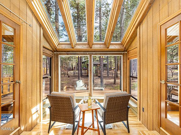 Single level home in one of Flagstaff's most desirable neighborhoods. This oversized lot sits on a double cul-de-sac lined with trees, making it peaceful and private. Mountain views from the front porch! Timeless wood cased windows, oak wood floors, stained glass, vaulted ceilings, skylights, tongue + groove accent wall, red wood porch, wood stove, and a sunroom. Meticulously maintained, this home boasts a new roof, new carpet, bathroom faucets, exterior & interior paint, and decks. Enjoy the outdoors year-round! This property offers a larger, fenced backyard with tall ponderosas and a gazebo. The outdoor space is ideal for al fresco dining. During the winter months, enjoy the wildlife from inside your sunroom. Continental Country Club amenities. Over on the green you will find residents of Continental Country Club spending their day golfing the expansive 18-hole course, getting a quick game in at the 'Timberline Short Course', or practicing their swing at the driving range. Private Aspen Course just a stone's throw away! You will also find residents at the tennis/pickleball courts, jacuzzi, fully equipped fitness center, or dining at the Oakmont. Close to great schools and Foxglenn park, making this one of Flagstaff's most desired communities. Don't miss your chance to call it home!
