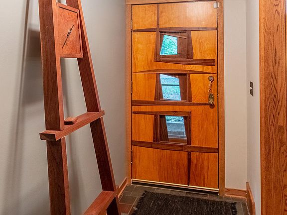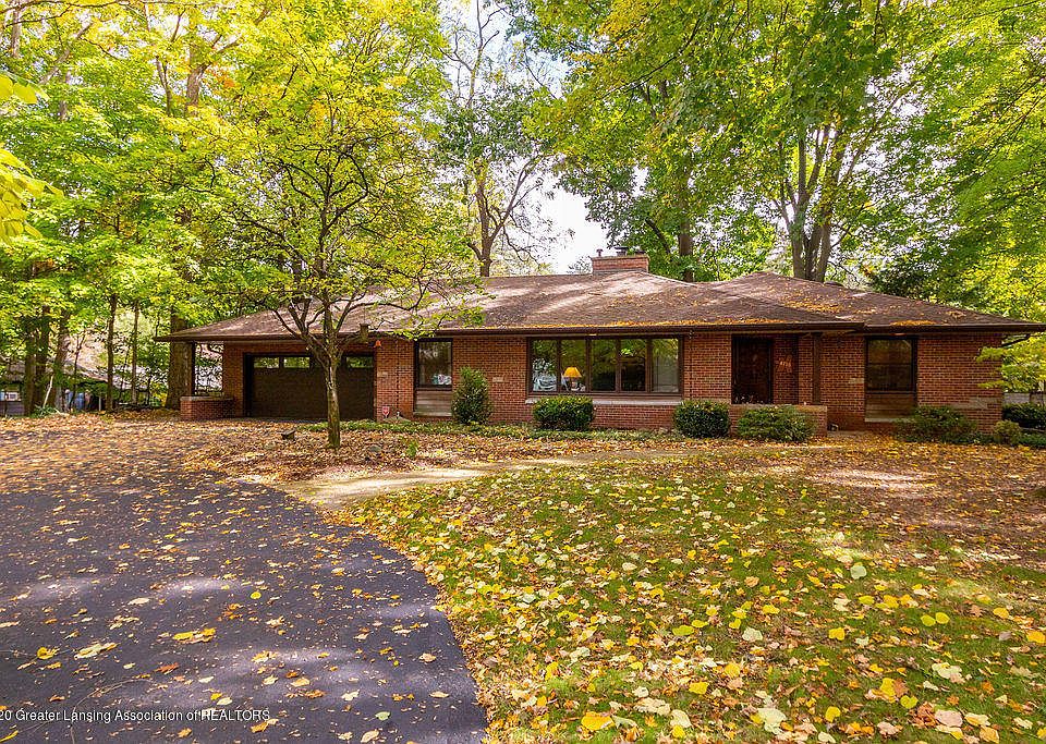 Mid-century ranch w/3 BRs 2 baths, on a double lot! An artistic impression comes to life starting w/front door to the foyer w/wood designs made from trees that were harvested on the property. A slate flr transitions into the open living/dining rooms w/original hdwd flrs, brick fireplace & a wall of windows w/sliding custom shoji screens that filter light but give privacy. Updated kit. w/granite countertops, medallion cabinets, a sculptured wood center island, & light fixture & stainless appliances produce a truly distinctive interior. An office/family rm w/built in shelving provides extra living space & leads to the master suite w/walk in closet & green house. The master bath boasts a whirlpool tub, shower, private stool room & heated tile floor. 2 more BRs w/hrdwd flrs & a 2nd bath w/heated floors & unique tile. Enjoy the scenery from the 4-season rm or relax on the large deck. The LL boasts a rec room w/wet bar, & a large flex rm & an exit to the back yard. Close to Okemos & MSU.