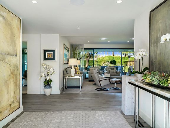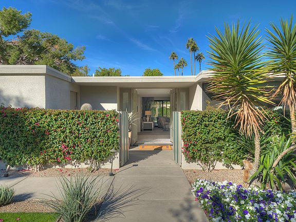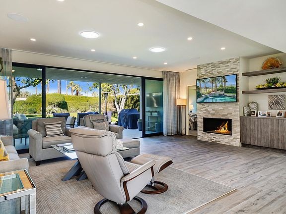 This exceptionally remodeled mid-century classically styled home fully furnished and move in ready! As you enter through the transformed glass doors, this home opens up to the living/dining and kitchen open concept. Light and bright with the added glass in the kitchen/dining area with quartz counter tops. Kitchen has Thermador stainless steel appliances, expansive counter top space & large island for extra seating. Living room is complete with an elegant stacked stone gas fireplace. Large sliding glass doors lead out to the covered outdoor entertaining space w/ fire pit, TV, sound system, & BBQ . The pool & spa are just steps away. Master suite, complete with walk-in closet. Two guest suites each have walk-in closets and full baths. Indoor laundry room and 2 car garage (2012) Lexus included plus golf cart garage.