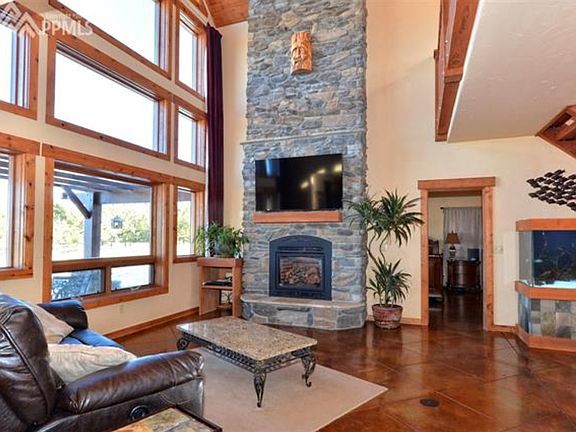 Come and experience this well built, custom home on a wonderful 2.24 acres providing seclusion and stunning views of Pikes Peak.When you enter the home with custom stone flooring you see the soaring windows all the way to the top of the cathedral ceilings next to the massive fireplace! The towering windows have remote control, electric drapes opening to the stunning views of Pikes Peak! The rest of the great room consiste of a wonderful, gourmet kitchen with all the goodies and a large eat in dining room that walks out to your latge patio. The master suite is wonderful and the large family room with wet bar leads into the other private guest bedroom on the main floor! Upper floor adds two more Large bedrooms, the loft/game room and another family room.