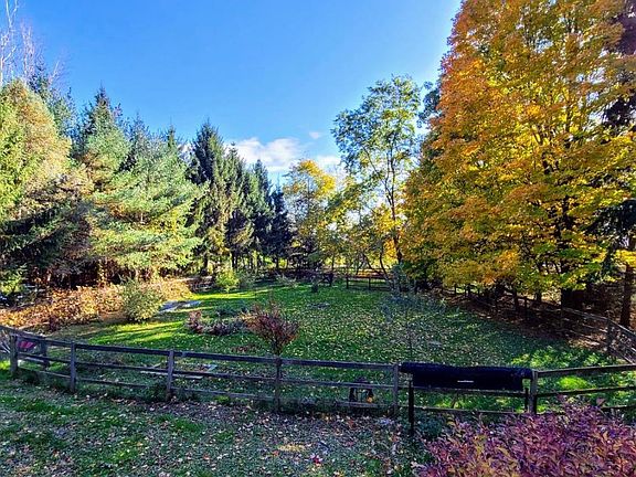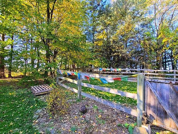Contemporary Lansing home built with attention to quality, detail and design tucked away on a private 1.4 acre lot with both mature trees and yard space. Not your average run-of -the-mill house! An unparalleled home with each floor offering unique space and features including tin ceilings and backsplash, cherry floors and trim, copper sinks, brick wall designed to radiate stored heat from the woodstove, cathedral ceilings, natural wood at every turn, stained glass, arched and circular windows, radiant in-floor heat, more! Three room primary suite with balcony and luxurious bath with jetted tub. Custom kitchen has updated appliances, granite counter, ceramic floor and opens to a dining area overlooking the woods. Screen-in rear porch, massive side deck and a wrap-around front porch, all with composite decking. New exterior paint! Two story outbuilding with power and 2nd floor for studio, shop, guests plus a fenced-in area for animals. Carport and high speed. Natural material throughout!