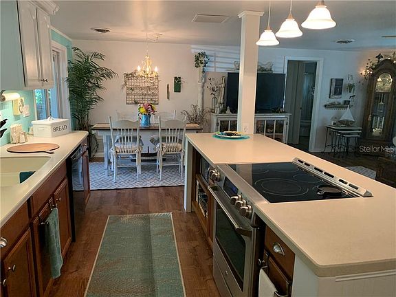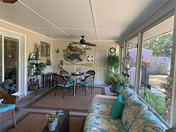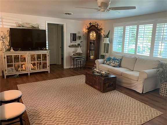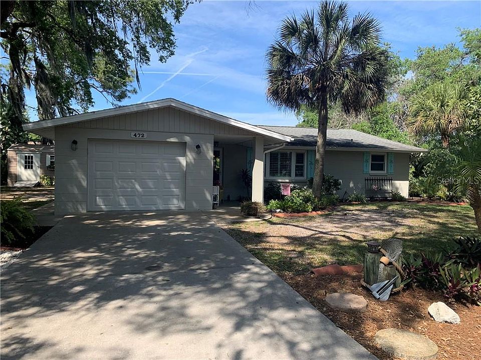 WHERE TO START! This dollhouse has been remodeled completely with a coastal chic flair! The new storm door leads to the living room, kitchen, dining areas that are completely open and have been updated with all luxury plank vinyl floors and special touches with wainscot and ship lap in just the right places. You'll find Plantation Shutters and impact windows. The kitchen is open to the living room with a breakfast bar. The solid surface counters and wood cabinets along with all new updated kitchen lighting and a reverse osmosis system for the sink and ice maker, makes this a comfortable cook's kitchen. The dining room has a new slider with built in blinds that lead out to a generous size screened lanai with new screening and trim overlooking a completely private back yard with vinyl fence and lots of palm trees. The master bedroom has a pocket door from the living room and features a walk in closet and slider to the lanai. The master bath has been completely updated with dresser style vanity, new commode and tiled tub/shower area along with Plantation shutters. The guest bath has also been updated with new vanity and commode. This home has been freshly painted inside and out. On the outside, you'll find all fresh beautiful landscaping with a manual watering system in place. The adorable shed on the side is just 2 years old and there's new seamless gutter all along the back of the home. Situation on a corner (curve) this home offers complete privacy. The man cave AKA: Garage even has ship lap walls, a built in workshop, slop sink and new reinforced garage door and opener. There's even an extra parking pad out front. The roof has the 3rd nail added for the best insurance rates. The septic tank was just pumped last year and the electrical panel was replaced in 2016. This dollhouse won't last long!