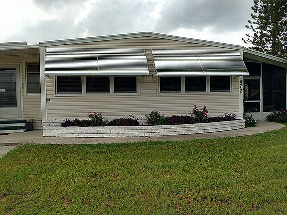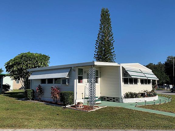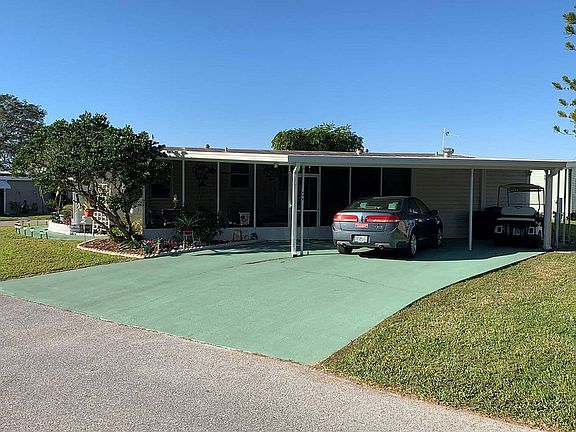 This is a mobile home in a 55+ pet friendly community on a rented/leased lot. This is a LARGE home situated on a corner lot in the South section with great curb appeal AND 4 parking spots! When you arrive at this home, you will immediately see a large driveway with a carport that will give you plenty of room on the driveway, sidewalk, & screened in lanai (lanai furniture included). There are many ceiling fans throughout the energy efficient home! You will love the LOW electric expense that averages $50 a month! On the left side of this Florida home, there is a bonus room with its own entrance. As you enter the home you will find an updated kitchen with updated cabinets, appliances, and countertops. The stainless steel side by side Whirlpool refrigerator is new too. The separate dining area has a beautiful built-in buffet for extra storage. The very large living room has all the room you will need for entertaining. As you move down the hallway you will come to the guest bath on the right and guest bedroom on the left. The master bedroom is at the end of the hall and is very spacious. Your large master bathroom has a walk-in shower and a large walk-in closet. This Florida home has a long list of NEW IMPROVEMENTS & UPDATES. ~Chefs kitchen with stainless steel refrigerator with filtered water /ice in the door and updated appliances. ~Master bedroom: new ceiling fan & wood slat blinds. ~Dining room: new LED lighting. ~Guest bath: new toilet. ~ Laundry room renovations: new entry door, insulated ceiling, new roof panels & insulation, new double pane windows, new drywall & insulation on west, accessory A/C unit, new wall cabinets & counter tops,. ~Workshop/storage: new shelving, & workbench with drawers. ~Air Conditioning & central heat have been serviced annually ~The roof has a rubber roof-over ~ Home has been pressure washed annually ~Washer/dryer are INSIDE the home and are included ~Wood laminate flooring throughout ~ Furnishings & golf cart are negotiable for the whole package! All listing information is deemed reliable but not guaranteed: no warranty expressed or implied; all homes are sold as-is. Condition & measurements should be independently verified through personal inspection or by appropriate professionals. Land Lease Community: Lot rent is $906.19 and includes water, sewer, trash, lawn and all the amenities! The lot rent is set by the community & is subject to change.