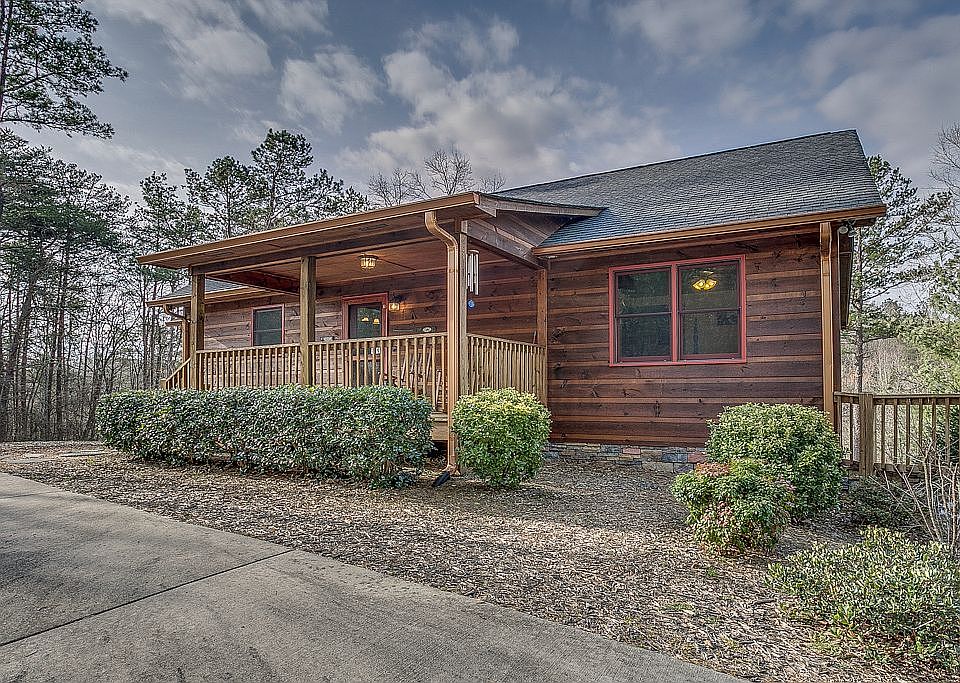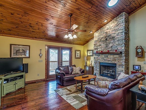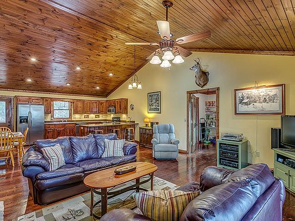 Scenic drive to super cute private log cabin ranch with finished basement with 3 BR, 3 full bathrooms conveniently located within walking distance to shops, restaurants, and movie theater. Covered porch on front and back of house. Newer paint, skylights installed to allow for more light, updated light fixtures, wood and smooth sheetrock ceilings, 2018 HVAC system, hardwoods throughout, stainless steel appliances, large pantry and laundry room. Rustic stack-tone fireplace with gas logs on main level living room, and propane heater in basement living room. Garage on lower level, plus parking pad on top level, so can park on either floor. Room for workshop. Alarm system installed. Hot tub included! Some furniture is negotiable separately from purchase and sale.