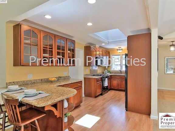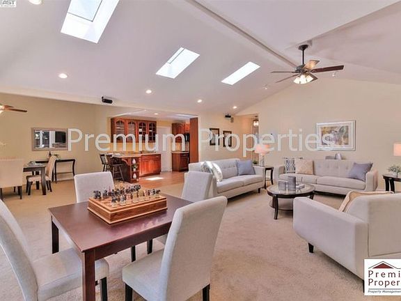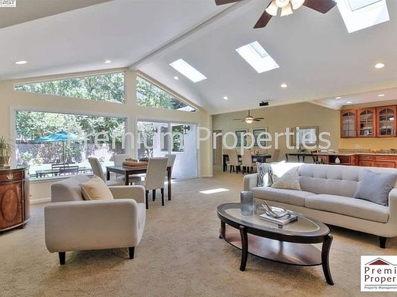 4 bedroom, 2 bath with aprox. 2117 sf. of living space. Great location, just steps to highly rated San Ramon Valley HS, downtown Danville and the Iron Horse Trial! This home has been nicely updated throughout with skylights offering plenty of natural light. Dual pane windows and carpeting throughout home except in 3 of the bedrooms (hardwood flooring). Entry to the living room with vaulted ceilings, stone gas-burning fireplace and slider leading to the backyard. The kitchen features laminate flooring and granite counter-tops. Appliances include; gas stove/oven, microwave, dishwasher and refrigerator. Family room located off the kitchen with slider leading to the backyard. The master bedroom is spacious with a walk-in closet with built-ins and luxurious master bathroom featuring marble flooring, double sink vanity, soaking tub and separate shower. The 3 remaining bedrooms have hardwood flooring and ceiling fans with lights. Hallway bathroom has a single sink vanity and shower over the tub. Backyard is spacious, just over 1/4 acre with mature redwood trees, patio, lawn area, and side RV parking-gardener included 10;Attached 2 car garage with storage cabinets. Washer and dryer hook-up located in the garage. Central heat and A/C. No Smoking. Pets negotiable upon owners approval with additional deposit. 472 Veda Dr. Danville 94526