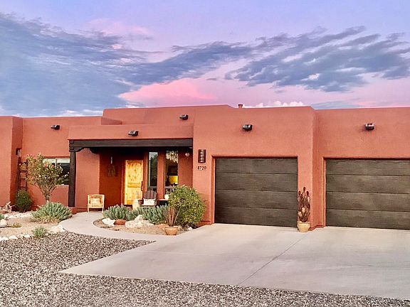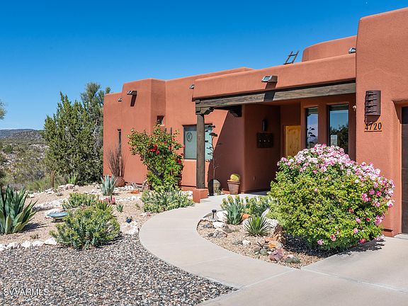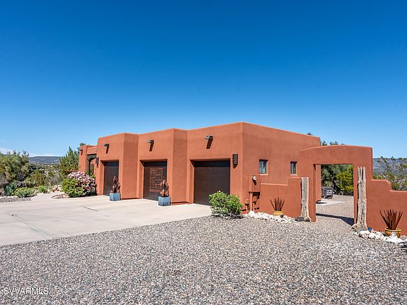 Experience the spectacular mountain views and serene privacy from this gorgeous Santa Fe Style home. The home is beautifully designed, positioned in a private Mesa-top exclusive neighborhood (Thunder Ridge), overlooking Montezuma's Well and Sacred Mountain. This is a unique area for those seeking a quiet or spiritual retreat. This well laid out, 1-level floor plan is designed to take advantage of views from every room. This house has an open concept, maple cabinetry, large pine pillars, stamped concrete floors, corner gas fireplace, huge eastern facing outdoor living space, and windows that capture stunning views. A stargazing rooftop deck offers a 360 star-studded view. The BONUS ROOM is an additional space for a studio, workshop, or suite. The Thunder Ridge community also has a neighborhood saltwater swimming pool and small clubhouse for personal gatherings.