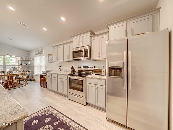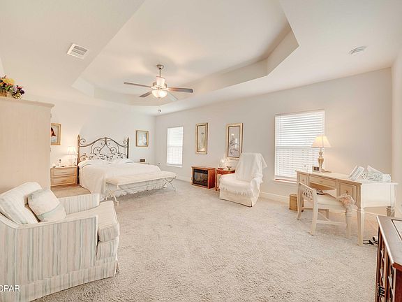 Check out this truly like new brick home that was built after Hurricane Michael so never went through the storm. This wonderful 3 bedroom, 2 full bath open floor plan is an incredibly popular floor plans. Great room is open and spacious and features cathedral ceilings. Check out the size of this master bedroom 22x14! The master suite is really oversized and features an eye-catching tray ceiling, bath has double vanities, huge walk in closet, garden tub, and separate step in shower with seat, plus private water closet. There is vinyl plank flooring throughout except for carpeted bedrooms. Kitchen is a great set up, stainless appliances, granite counters, and a large laundry room with pantry area. Lovely lanai off the back of the home overlooking your privacy fenced backyard. Full 2 car garage. There is a sprinkler system on well. Open house Sunday June 4th, 1:00-4:00.