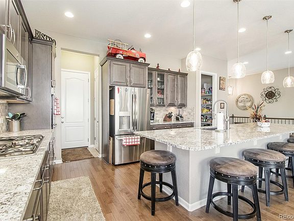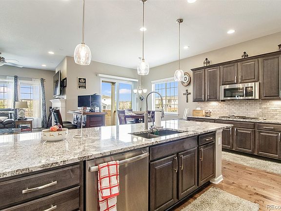 Amazing opportunity to live in a new house in highly sought after Copperleaf Subdivision bocks from all the local Cherry Creek School District Schools. Barely lived in, built 2016, occupied in February 2017. Amazing updates including heated, finished and fixtured garage (true man cave), walk-out basement with build-out ready for permitting and final finishing stage (easily add bedroom, full bathroom, plumbed wet bar and tons of storage), beautiful high level interior finishes, and the exterior is professionally landscaped to the extreme all waiting for the right family to make this their dream home. This backyard is huge and absolutely amazing with a large patio, a fire pit, a bubbling fountain, foundation for a hot tub all pre-wired, and so many other really upscale features to further your lap of luxury experience. There are so many upgrades in this house they are difficult to list. Wood floors, 3 zones wired for sound (including raised deck), gas plumbed for back deck grill, bay window added to dining room, subway tile back splash in kitchen, granite counters, beautiful kitchen finish choices with large island and under counter sink with great spray-rinse type faucet, stainless appliances including double oven. This is a must see for sure.