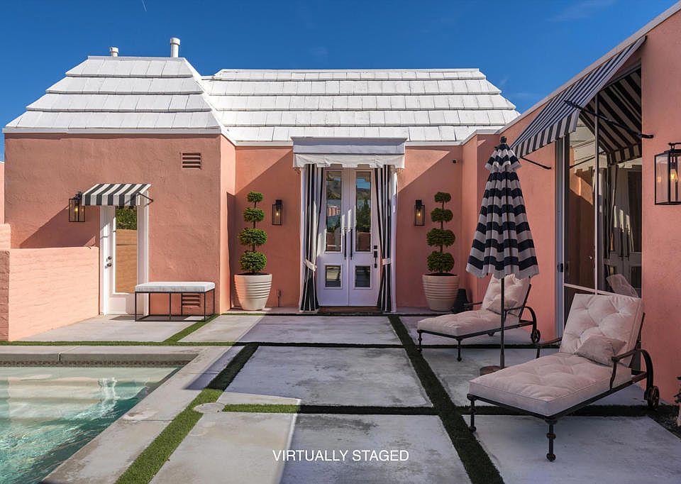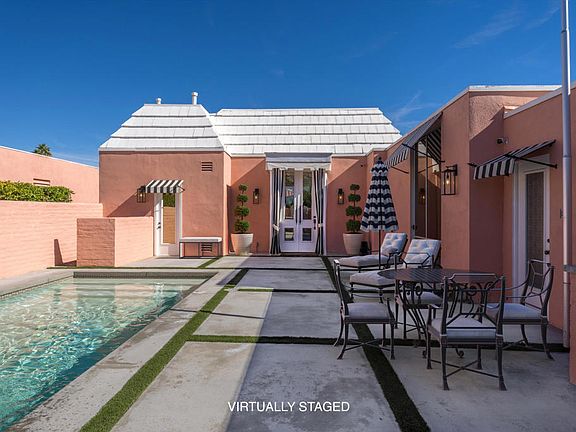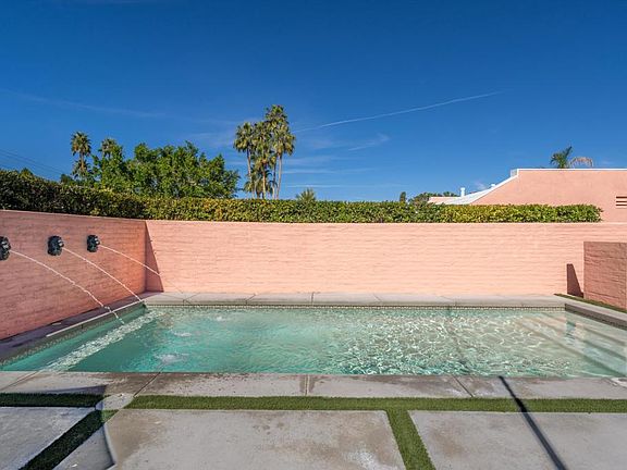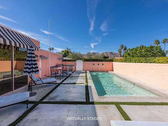 Experience the five-star luxury and exclusivity with this exquisite residence situated in prestigious Marrakesh, where high-end country club living awaits. This meticulously crafted John Elgin Woolf Hollywood Regency jewel offers an unparalleled indoor-outdoor lifestyle, perfect for those who appreciate privacy and the art of entertaining. Step through the grand beveled glass front doors into the living space boasting towering ceilings, an original slump stone fireplace, and majestic 10 ft sliding glass panels that reveal an extended terrace adorned with a lush bougainvillea privacy hedge, offering stunning views of Eisenhower Mountain and the golf course. The chef's kitchen is equipped with Wolfe range, glass door Subzero refrigerator and Subzero wine cooler with 60-bottle capacity. Ceramic tile floors extend across the living areas and the back terrace. Relax in one of the two bedroom suites, each remodeled with a nod to the iconic Marrakesh style, complete with classic vanities and spacious walk-in closets. Step outside to your private oasis where a saltwater lap pool, which can be heated and even cooled, is framed by wall-based fountains and a midcentury modern canopy. An outdoor kitchen, featuring LYNX grill and Sub-Zero refrigerator, ensures your gatherings are an absolute delight. With club membership benefits including golf, tennis, pickleball and fine dining at a newly remodeled clubhouse with stunning views, this home isn't just a residence - it's a lifestyle!