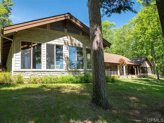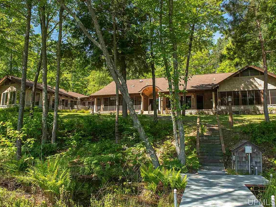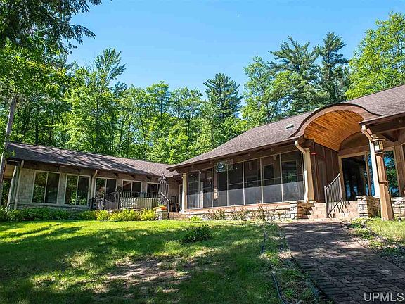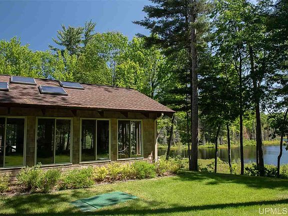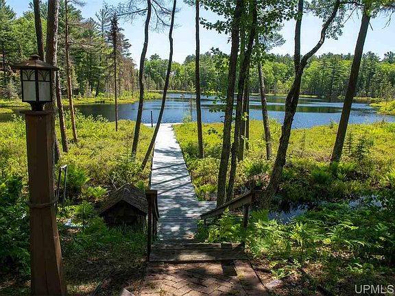 Nothing like it anywhere! Private, gated, paved tree lined drive with brick slope to garage and parking area. Cherry wood floors, cabinetry and solid cherry doors. Corian counter tops, subzero stainless refrigerator, Thermadore wok and grill. Commercial grade hood fan and custom etched glass art wall. Separate dining area with dramatic floor inlays and tiered ceiling. Beverage/bar area facing the lake with sink and amenities. Fireplace in living room with gorgeous wood ceiling! Bedroom/office has its own bath and master en suite is amazing!! Separate his and hers bathrooms with walk-in closets, walk-in showers and bedaze. Patio door to screened 3 seasons room with 2 queen sized Murphy beds all facing the lake. Imagine the loons and frogs singing you to sleep in the cool of the night. Indoor heated pool with hot tub and rinse shower. Also included is a bonus 4 bedroom guest cottage with garage (little to no value). Tons of storage in garage, whole house generator. Every room has an amazing view of this aprox. 20 acre lake! Grab the trails from your 36 acre retreat during summer or winter! This heirloom property has it all, all year round!!! Home was built by Hugh Shanks .