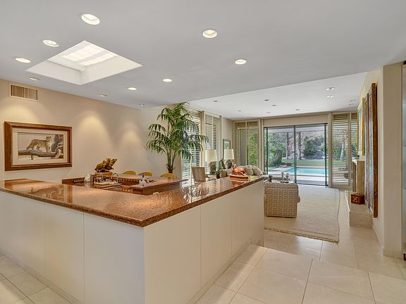 Soft, classic and contemporary home available in the private Eldorado C.C. As you walk thru the foyer, the soft clean lines of the entry draws you into the grand Dining and Living room spaces. Living room, with sit down bar area and high ceilings, opens up to the outdoor space with a crystal blue pool and spa with majestic mountain views. Spacious dining room opens up to an outdoor courtyard. Kitchen, with stainless steel appliances, also has a breakfast nook with beautiful mountain views. Large Master Suite includes doors leading out to the spa and pool, large master bath with double sinks and walk-in closet. There are two guest bedroom suites, laundry room and large garage with golf cart garage.