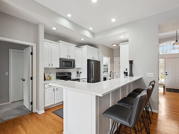 Tucked away in a quiet enclave yet just minutes from shopping, dining, and everyday conveniences, this updated 3-bedroom, 3-bathroom townhome offers the perfect blend of privacy and accessibility. Step inside to find a fresh, modern interior with new carpet, updated lighting, and fresh paint throughout. The flow-through living space is ideal for entertaining, while the updated kitchen boasts sleek quartz countertops and ample cabinetry for storage. You will love having a spacious laundry room to hide the mess! Main level bathrooms have been renovated with fully tiled showers, differentiating this unit from others in the area. The spacious primary suite features walk in closet space and a double vanity en-suite bath. Finished basement has daylight windows for great lighting & 2nd cozy fireplace. You will also find a huge 3rd bedroom/walk in closet with access to a full bathroom. Generous storage options throughout the home ensure a place for everything, including the unfinished basement area. Enjoy a south-facing driveway for quick snowmelt in winter, and relax in the serene surroundings of mature trees that add to the charm and seclusion of this home. Per previous owner: roof new in 2021 & furnace & AC new in 2018. Kinetico water system.