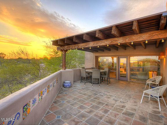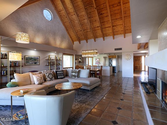 This home is an architectural & design masterclass by David Tyson, Father of the Southwest Contemporary style. Nestled in the Catalina Foothills and highlighting unrestricted city and mountain views, this retreat features Tyson's striking and colossal rectilinear horizontal rooflines, wood window framing, stucco walls, and contemporary interiors including recessed skylights and natural stone accent. Perfectly situated on a small hilltop with only three other homes, this private lot with circular driveway is surrounded by spaciousness and a lush, mature desert landscape. This brilliance comes fully furnished, making it a true turnkey home. Inside, the 3bd/2ba 2368 sq ft split floor plan home features a North & South orientation which allows for year-round enjoyment of five... See MORE tab ... five distinct patios, the largest an idyllic backdrop for daily sunsets, and large enough for entertaining. The main living area opens to the kitchen, dining & living room creating an intimate great room. Meanwhile, a spectacular cathedral ceiling allows you to breathe deeply and revel in multi-directional beauty, including floor to ceiling windows, gas fireplace and a stunning venetian plaster accent wall created by a local artist. The kitchen boasts a huge island clad in granite with ample solid wood cabinets, LG side by side refrigerator, breakfast nook, breakfast bar, glass tile backsplash, dual ovens, gas cooktop, microwave, prep sink + coffee nook. The Primary suite is spacious and attached to a dual vanity bathroom with jetted tub, separate shower & large walk-in closet. Two guest bedrooms/office share a bathroom with the same high-end finishes as the primary including Casa Endeavor ceiling fans. Appreciate the refinished earth-tone Saltillo tile that reaches from the entryway & continues throughout, including the rear deck. Off the kitchen is the no-step entrance to a finished garage with space for storage and an insulated garage door. Fresh indoor/outdoor paint, new window blinds, new Trane thermostat & innumerable updates display pride of ownership. All this beauty is set in a historic and sought-after, centrally located neighborhood in the foothills of Tucson. Close to excellent restaurants, recreation, La Encantada Mall and more, yet worlds away in this private "lock & leave home" or as your year-round oasis. No HOA. Welcome to Paradise.