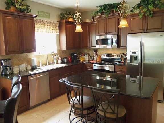 Beautiful Freshwater Neal Communities built home in wonderful Forest Creek. Gated community with huge lake up front with island. Several other lakes throughout. This home is located on a curve in the road which makes for an enormous and very private back yard. Extended lanai with cage. Beautiful coffered ceiling in living room with crown moulding and built-in lighting with dimmer and surround-sound speakers. Beautiful large Ceramic tile in living area. Gorgeous real dark wood cabinets and granite countertops with convenient center island in the large kitchen. Pretty tile backsplash. Big walk-in pantry and large eat-in space off the kitchen. The front room in the home could be used as a formal dining room or a media room (as it is currently being used) or anything at all you want to use it for. Hurricane shutters are provided. Indoor laundry room including washer and dryer. 2-car attached garage with attic storage. A really wonderful home all ready to move in! Forest Creek offers a heated resort style pool, spa, two playground areas, dog park with separate places for small and large dogs, several gazebos, well-equipped exercise room, fishing pier out into the large lake, canoe storage racks, and a number of beautiful park areas with ancient oak trees. Recreation center features meeting areas and a large billiard room. Miles of walking paths and abundance of wildlife! Quick closing is available.