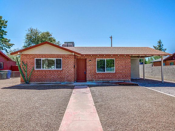 Charming red brick home tastefully remodeled and move-in ready! New soothing interior palette, ceiling fans, beautiful tile floor, and lots of natural light. Spacious kitchen features tiled counters, glass tiled backsplash, SS appliances, and upgraded wood cabinetry. Great gathering place for family and friends. Dining area with patio access and upgraded lighting. New plush carpet in all the right places. Upscale bathrooms with designer tile and fixtures. Large backyard mature fruit trees and cozy patio. A must see ''gem'' in the desert!