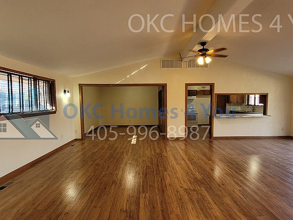 Welcome to this spacious mid-century modern home in the desirable Bush Hills 4th Addition neighborhood of Oklahoma City! This 3 bedroom, 3 bathroom house features a gas fireplace, solid surface flooring throughout, and an updated master bathroom. The large living room boasts a vaulted ceiling and two ceiling fans, perfect for relaxing or entertaining guests. Enjoy meals in the separate dining room or take advantage of the large fenced back yard for outdoor gatherings. With a covered circle driveway and a large storage building, this home has everything you need for comfortable living. Don't miss out on this unique mid-century home! Tenant pays all utilities. Tenant must provide their own washer and dryer. This is a no smoking property. This is a no pet property.