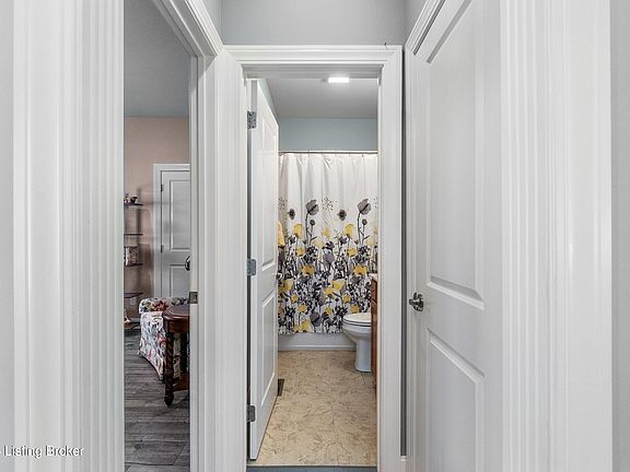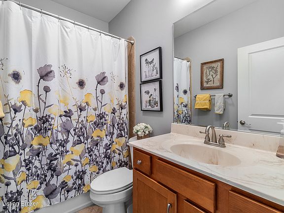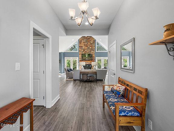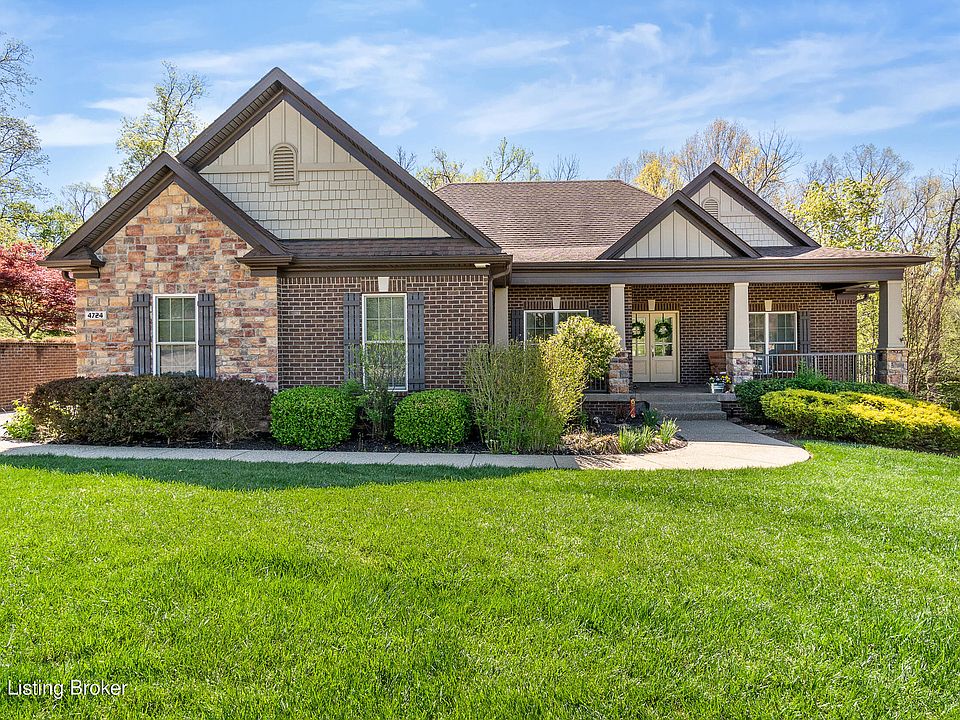 Beautiful open floor plan (Jamestown Lodge Elite floor plan), spacious Eat-In Kitchen with granite topped 5x7 island and pendant lights, great for serving or sitting for meals. Granite counter tops and marble back splash, stainless steel appliances and gas cooktop. Lovely wood flooring, Great Room with 2 story stone gas fireplace with electric starter. Doors to Trex Decking with Iron Railing and Retractable Awning with remote. Primary En Suite and 2 additional Bedrooms and 3 Full Baths on first level and addtional Bedroom and Bath in Lower Level. Washer and Dryer to remain. Laundry/Mud Room off Garage and Kitchen. Lower Level enjoy Family Room with lots of light from outside, spacious Bedroom with Large Walk In Closet, Full Bath and Storage Room. Walk Out Basement to your private Patio. Enjoy your privacy from your Deck or Patio, Property backs up to wooded area and creek, located in the Estate Section on a cul-de-sac. Grounds feature an Irrigation system for convenient watering. One owner home!