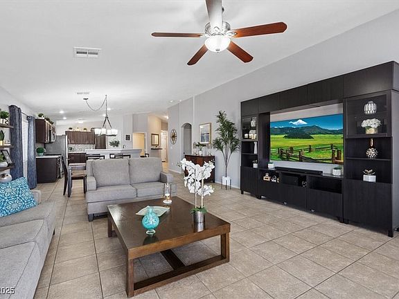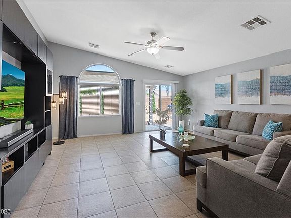 Beautiful single story home featuring 4 bedrooms, 2 bathrooms, and a spacious 2 car garage. Enjoy tile flooring throughout the main living areas and luxury vinyl in the bedrooms. The open concept layout offers a bright and expansive living space perfect for entertaining. The kitchen boasts quartz countertops, stainless steel appliances, a large island, and ample cabinet storage. The primary suite is filled with natural light and includes an oversized walk-in closet and a stunning ensuite bathroom with a custom updated shower and vanity. Step outside to a lovely backyard with a pergola covered patio, an above ground pool, and owned solar panels for energy efficiency. A true gem in North Las Vegas!