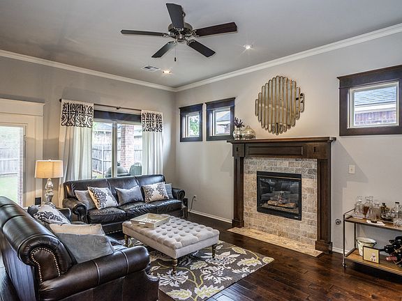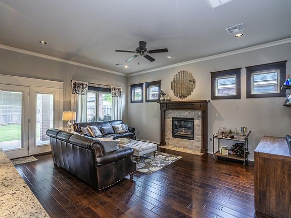 Meticulously maintained home in Arbor Creek community. Unbeatable location off I-35 offers quick access anywhere in the city. Rich wood floors and wood-look tile provides a clean look and easy to maintain flooring throughout. Designer lighting, current light color palette, dark wood accents and unique design touches make this home look like something straight off HGTV. The great room is perfect for gathering with friends and family with a cozy fireplace you light with the flip of a switch. The kitchen has a large island with breakfast bar, great storage, tile backsplash and granite countertops. The Master Suite has an ensuite bathroom with whirlpool tub, shower, 2 sink vanity and LARGE walk-in closet with builtin dresser. Two secondary bedrooms and a second full bath round out this flexible floor plan. The backyard has a great covered patio as an extension for entertaining. This gem will not be available long, so schedule your exclusive showing today.