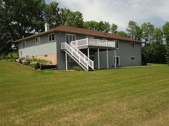 Setting on a 2.92 acre lot this house has 4400 sq. ft. finished with the back yard located next to a large community pond that has wildlife and can be used for recreational purposes. All the rooms in this house are spacious featuring 4 bedrooms, 3 bathrooms, a walkout basement, and a maintenance free deck. The kitchen has ample cabinets and the countertop was recently replaced and a backsplash was added. The home has lots of storage and a pantry cabinet in the laundry room located next to the kitchen. Recent updates include shingles, boiler furnace, Anderson replacement windows, water heater, attic insulation, paint, along with several bathrooms. The hot water boiler runs on propane though the MDU natural gas line is adjacent to the house. A well is located on the property though it has not been used for several years. There are a variety of trees including apple trees. In the back yard is a 24x34 detached 3 stall garage. So much more to offer!