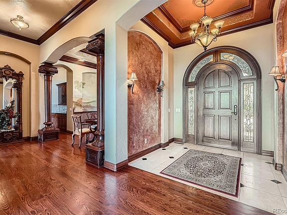 This stunning 7,000 sq. ft. custom-built home offers luxurious living on 5 beautifully treed acres in the exclusive Sterling Tree Farm neighborhood, with breathtaking Pikes Peak views. The main floor features exquisite mahogany trim throughout, a spacious chef’s kitchen with Butler’s pantry, and an elegant dining room with custom painted murals. Two expansive main-floor bedrooms each feature private laundry, while the lower level offers three additional bedrooms, another laundry room, a upscale theater, and a beautifully appointed secondary kitchen complete with dishwasher, cooktop, and microwave/oven.