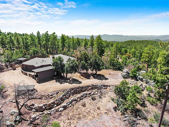 Amazing home nestled among the trees overlooking the National Forest with panoramic views. Incredible unique turn key home with 12-18 inch thick rammed earth walls. Beautifully designed with contemporary touches and warm inviting floor plan. In floor radiant heating plus fireplace, quartz countertops, 12 inch beams in ceiling, alder doors and cabinets. Metal roof and stucco exterior. Oversized carport with storage. Extensive rock work in walls and fencing. Corner outside fire pit in fenced back yard. The views are unbelievable and breathtaking. Perfect second home or weekend get away. Too many features to list. This home was built with well designed engineering added input from Arco Santi craftsmanship. Home is one of a kind and awesome! Gated community with no HOA. Appliances convey..