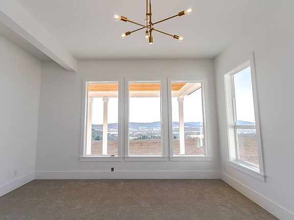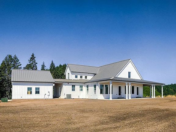 This farm style home sits on 10 acres and has a fantastic view. The gray metal roof contrasts with the white board and batten siding giving the home a contemporary farmhouse look. The generous wrap around covered porch provides ample room for outdoor living. The interior boasts soaring ceilings and large windows to brings the outdoors in. The open floor plan is great for entertaining and includes the kitchen, dining room, mini bar and full-size wine refrigerator, and great room with a brick fireplace. A beautiful breezeway connects the garage to a large mudroom.