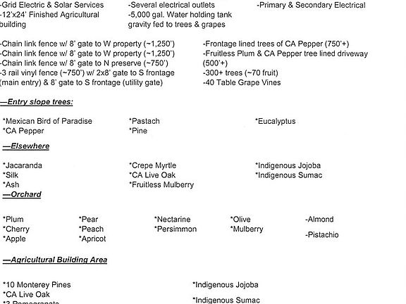 See the attached inventory list of improvements and amenities, including but not limited to a 12’x12’ pavilion, 8’x14’ shed/“well house,” 8’x10’ generator house, primary & secondary power sources, 2 storage containers, 5,000 gal. water holding tank, 45 water outlets, multiple electric boxes, waterline infrastructure for timer regulated irrigation system to support the 300+ trees, vineyard, green house/chicken coop and 300+ solar lights.